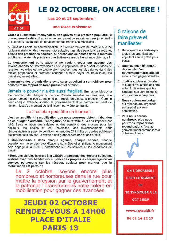 LE 02 OCTOBRE DANS CHAQUE AGENCE OU SERVICE, MARCHONS ET AMPLIFIONS LE MOUVEMENT ENGAGE A LA CEIDF. SUR LES RESEAUX SOCIAUX AFFICHONS LES GREVES A LA CEIDF.  « JUSTICE SOCIALE ET FISCALE, AUGMENTATION DES SALAIRES ET MEILLEURES CONDITIONS DE TRAVAIL, ABROGATION DE LA REFORME RETRAITE A 64 ANS »