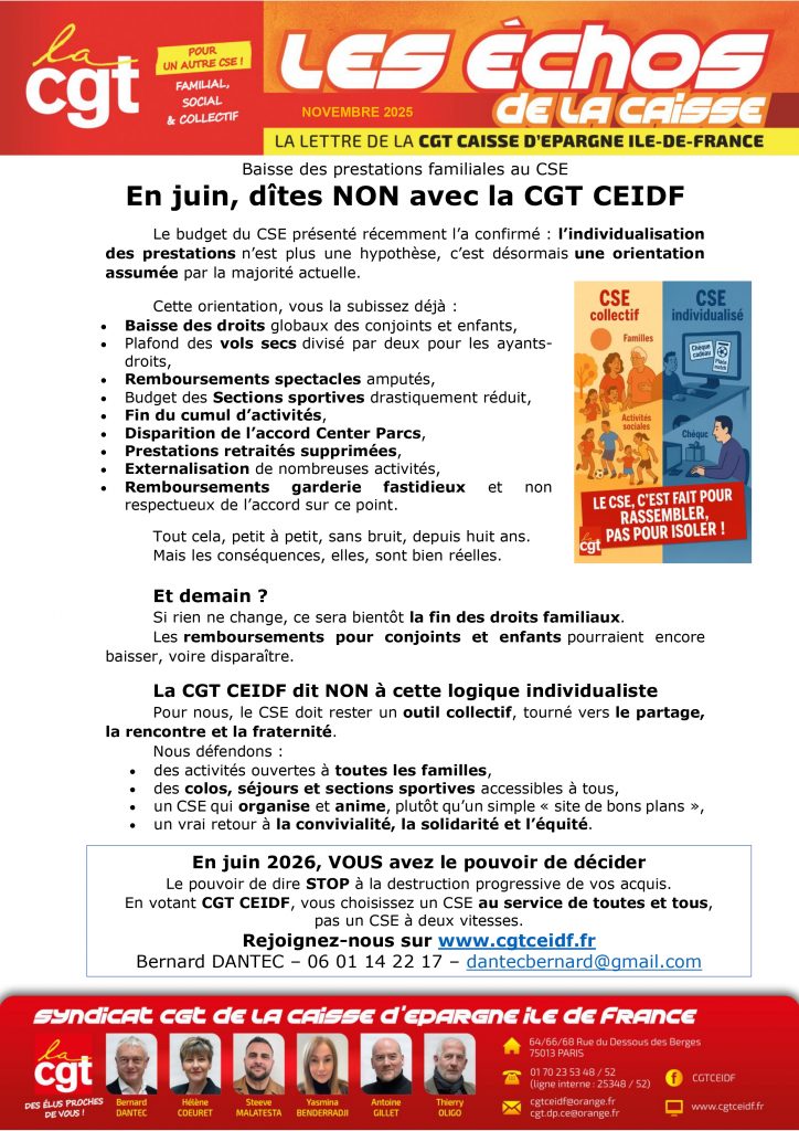 Baisse des prestations familiales au CSE 25/11/2025 0 Commentaire(s) in A la une, Newsletter, Tracts Auteur : admin Le budget du CSE présenté récemment a confirmé l’individualisation des prestations donc une baisse des prestations aux familles En juin dites NON avec la CGT CEIDF
