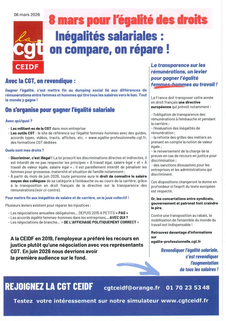 L’égalité doit être une réalité. EXIGEONS-LA ! 06/03/2026 0 Commentaire(s) in A la une, Newsletter, Tracts Auteur : admin La manifestation partira dimanche 08 mars à 14h de la place Stalingrad 75019.